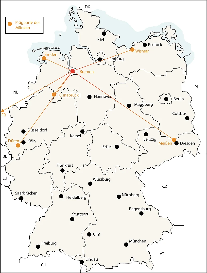 Auf der Verbreitungskarte (Abb. 5) sieht man, dass die Bremer mit ganz Deutschland und auch Frankreich Handel getrieben haben. Hierbei fällt besonders eine Münze ins Auge (Abb. 1.150). Diese stammt aus Emden und wurde eigentlich nur in der Umgebung gefunden, da Sie nur in dort als Bezahlungsmittel benutzt wurde. Die Münze wurde von 1453 bis 1464 hergestellt und von Ulrich Cirksena als Häuptling von Emden in Auftrag gegeben.