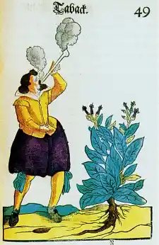 Im 16. und 17. Jahrhundert kam der Tabak, der damals noch sehr selten war, aus Amerika nach Europa. Erst wurde er noch als Heilpflanze angebaut, wie der Text in einem Kräuterbuch aus dem Jahr 1656 zeigt. Hier ist zu lesen: „Dieses Kraut reinigt Gaumen und Haupt, vertreibt die Schmerzen und Müdigkeit, stillt das Zahnweh, behütet den Menschen vor Pest, verjagt Läuse, heilet den Grind, Brand, alte Geschwüre, Schaden und Wunden“ (von Babo 1852).