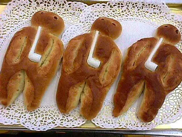Heute kann man noch ähnliche Pfeifen bei Weckmännern bzw. Stutenkerlen sehen (Abb. 3). Einer Legende nach waren einem Bäcker einmal die „Bischofsstäbe“ ausgegangen, die bis zu diesem Zeitpunkt die Weckmänner in den Händen hielten. Als Ersatz nahm er einfach Tonpfeifen, weil diese wie umgedrehte Bischofsstäbe aussahen (Weckmann).