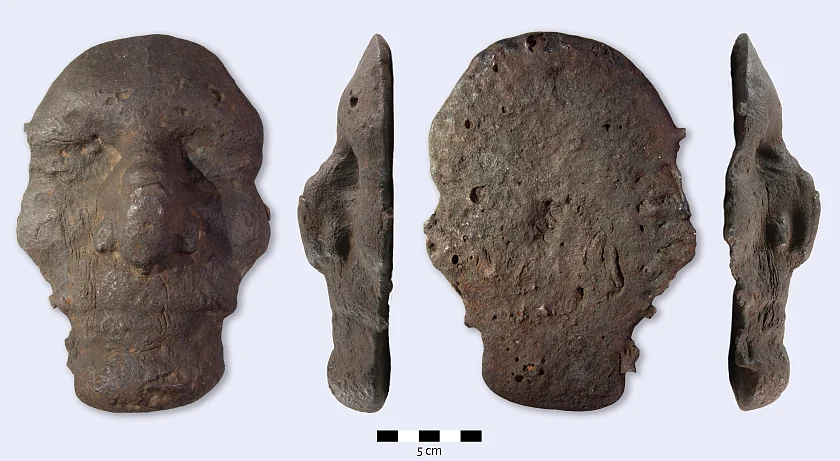 Im Jahr 1984 kam bei den vorbereitetenden Bauarbeiten zum Umzug der Mumien des Bleikellers diese Eisenmaske zum Vorschein. Bei dem lebensgroßen, ca. 2,5 Kg schweren Objekt handelt es sich vermutlich um den Abguss einer Totenmaske. Hierfür wurde das mit Gesicht des Verstorbenen mit Gips nachmodeliert und die entstandene Form mit Eisen ausgegossen. Details, wie das prominente Kinn und die markante Nase sind sehr gut zu erkennen. Es ist nicht bekannt, wann die Maske in den Boden gekommen ist. Vermutungen deuten aber auf das 17./18. Jh. hin, die Zeit aus der auch die Mumien im Bleikeller stammen.