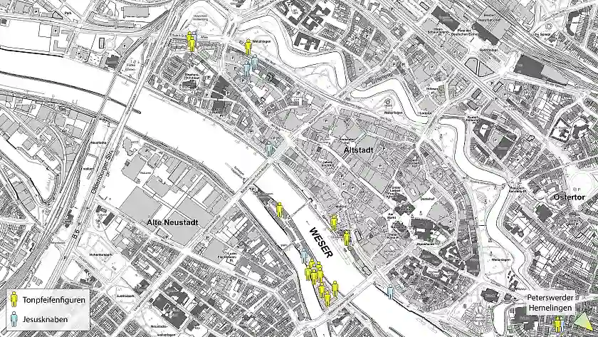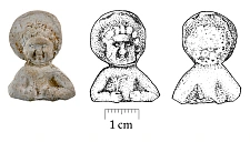 Nicht einmal 100 Meter vom Fundort dieser bräunlichen Tonminiatur entfernt wurde der Teil eines weiteren Figürchens gefunden (Abb. 3). Von ihr ist nur noch der Kopf und der Oberkörper erhalten. Dabei handelt es sich aber nicht um eine Figur der gleichen Machart, da diese tatsächlich aus dem weißen Ton der Pfeifen besteht. Der Kopf ist der eines kleinen Jungen mit Heiligenschein, in einer Hand hält er einen kleinen Zweig, möglicherweise handelt es sich um eine weitere Jesusdarstellung. In Bremen wurden nicht viele dieser Figürchen gefunden. Die meisten Exemplare befanden sich nahe der Weser, wie zum Beispiel eine Figur vom Teerhof (Abb. 4). Sie dienten in Bremen, einem beliebten Pilgerort der damaligen Zeit, wohl oft als Devotionalien im Dom. Die Verteilung der in Bremen gefundenen Figuren kann auf der Karte von Abbildung 1 angesehen werden.