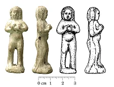 Der Kopf und der untere Teil der Figur fehlen leider, weshalb nicht erkennbar ist, worauf sie sitzt. Obwohl das Material, aus denen die Figurchen bestehen, für sie namensgebend ist, besteht diese Figur aus einem anderem Ton. Es handelt sich hierbei um bräunliche Irdenware statt dem üblichen weißen Ton der Tonpfeifen.