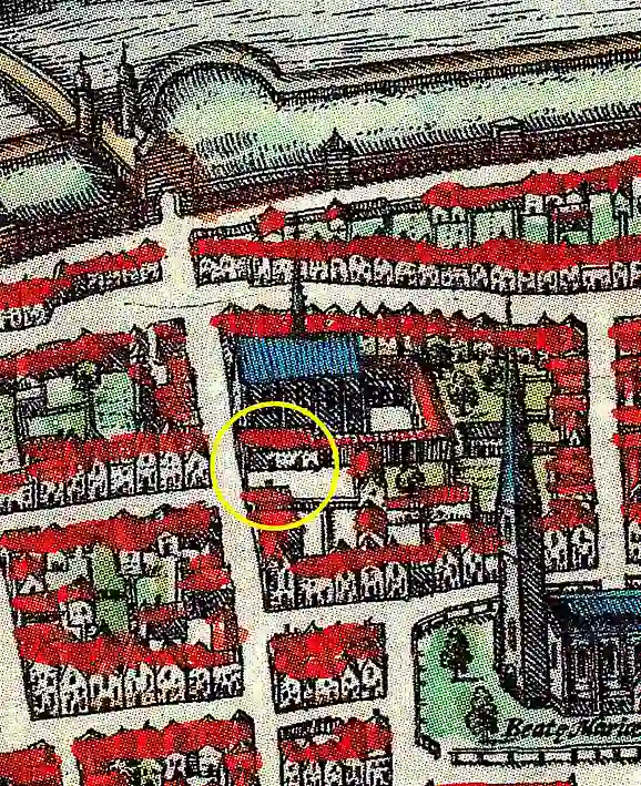 Kupferstich von Bremen 1588/89 von Hogenberg mit dem entsprechenden Gebäudeteil des Katharinenklosters