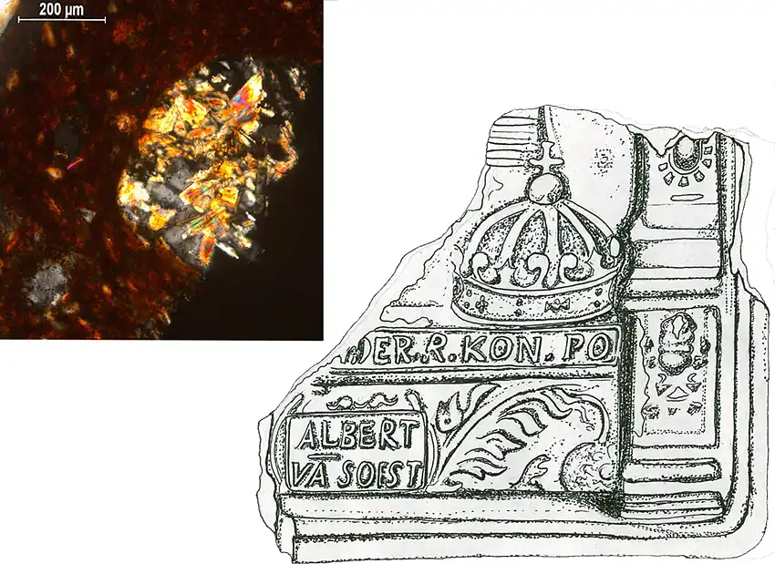 Vulkanisches Gesteinsbruchstück in der Bremer Ofenkachel mit der Signatur des Albert von Soest (Unzeichnung rechts) weist Parallelen zu Lüneburger Baukeramik auf. Polarisationsmikroskop-Foto (C. Grader, Inst. f. Mineralogie, Leibniz Uni. Hannover / Zeichnung des Kachelfragments von H. Hoor)